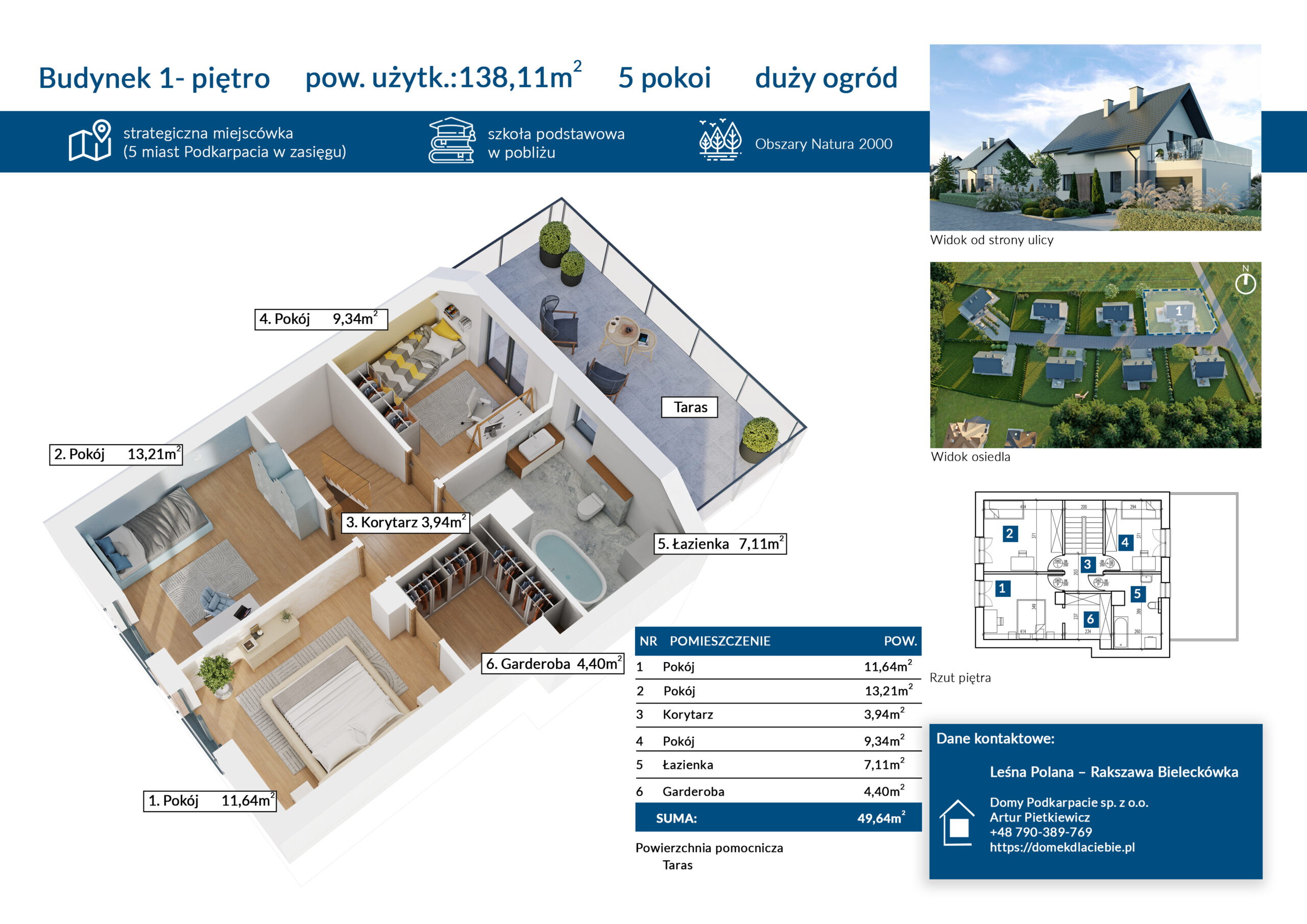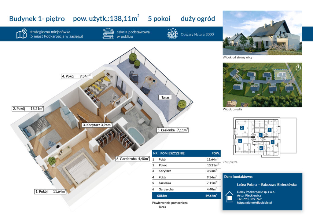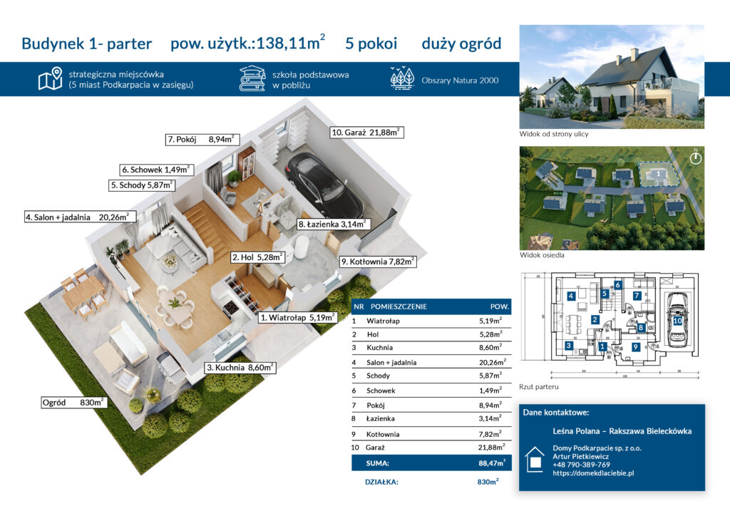 Budynek nr 1 to Dom w Zielistkach GNT lustrzane odbicie, znajdujący się na skraju osiedla ze wspaniałymi widokami z tarasu nad garażem na pobliskie łąki i las. Niezapomniany widok, zapierający dech w piersiach. Ściany zewnętrzne budynku wykonane z pustaka Solbet, który zapewnia dobrą izolację cieplną (oprócz oczywiście styropiany), łatwy w formowaniu, łatwość wywiercenia otworu w ścianie, w porównaniu do pustaka ceramicznego, mniejsza podatność budynku na mostki termiczne. Taras wykonany w systemie płaskiego dachu, zapewniający minimum 20 lat bezawaryjnego korzystania. Technologia na dzisiejsze czasy, zapewniająca komfort mieszkania.